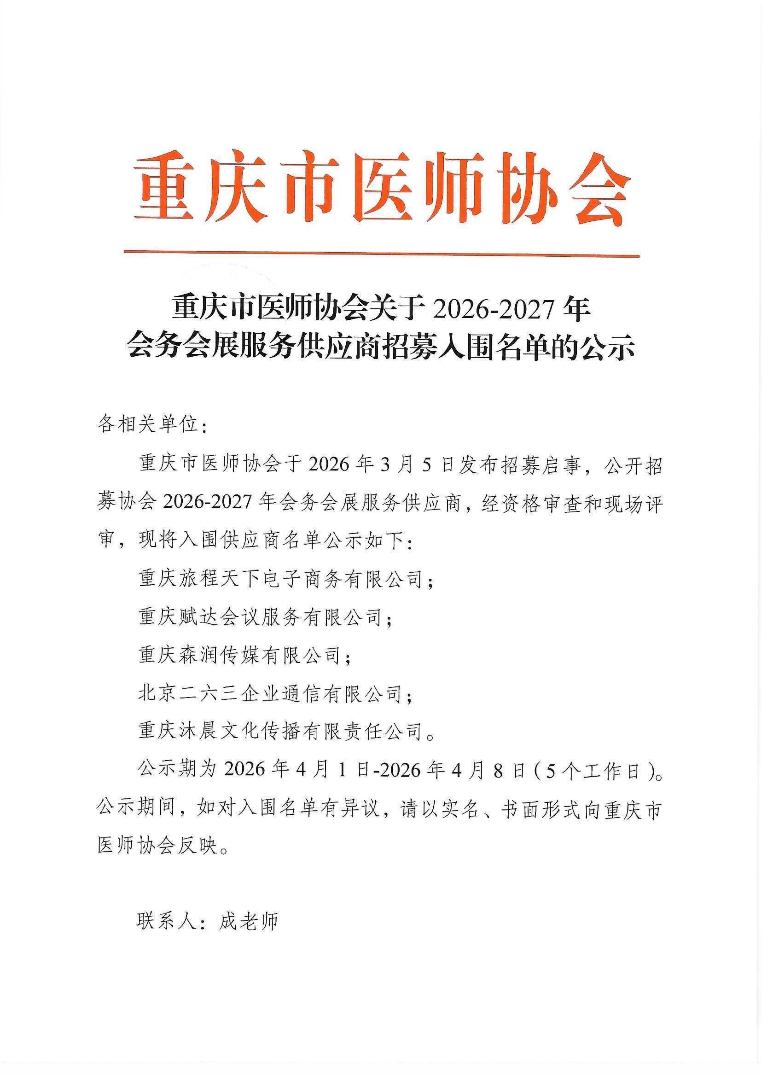 重庆市医师协会关于2026-2027年会务会展服务供应商招募入围名单的公示