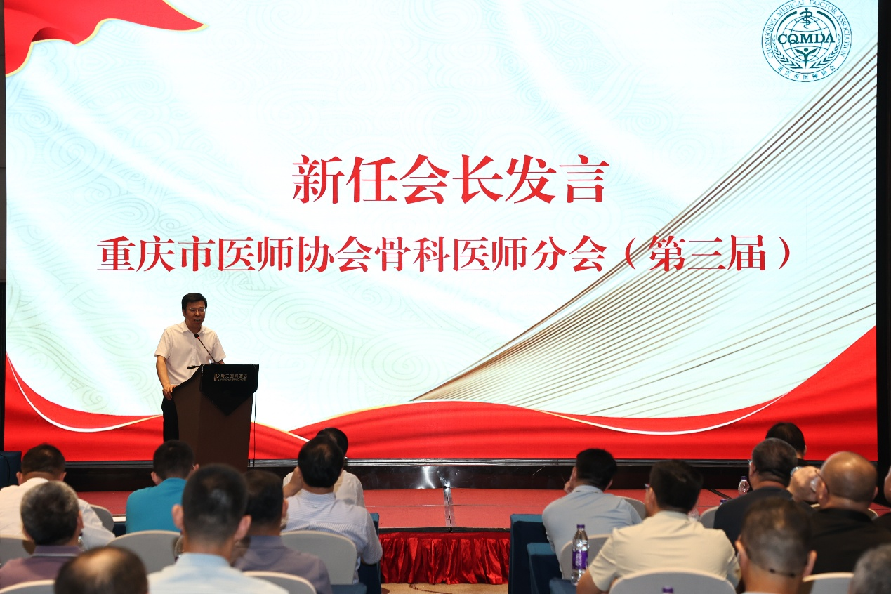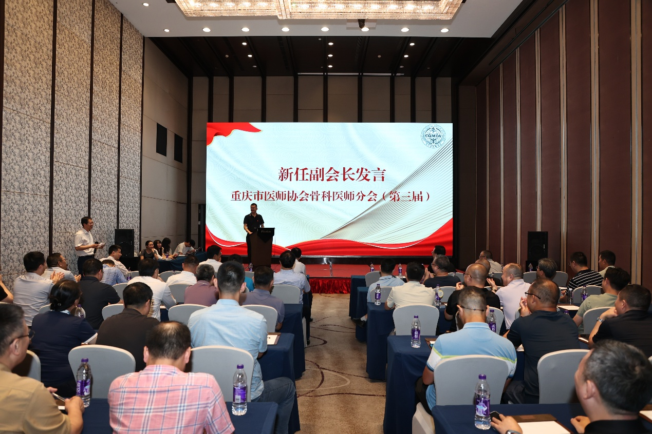 重庆市医师协会副会长兼秘书长范宏连发表讲话,他首先对新一届委员会的成立表示热烈祝贺,对上一届委员会的辛勤付出和卓越贡献致以衷心感谢,并对分会未来工作提出了明确要求:第一,要在办会程序、班子分工、会议任务完成及年度计划落实等四个层面做好工作;第二,要严格贯彻、落实国家法律法规,遵守八项规定精神,确保廉洁节俭地举办各类学术会议和活动;第三,要遵循重庆市医师协会章程和分支机构管理办法,积极开展学术研究与交流活动,推动学科建设和人才培养,提升骨科医师分会学术影响力和服务能力;第四,分会班子成员要明确职责分工,从意识形态、财务管理、组织建设等方面强化分支机构内部管理,共同为重庆地区骨科医疗水平的提升和学术交流作出积极贡献,为广大群众提供更优质、更高效的医疗服务。