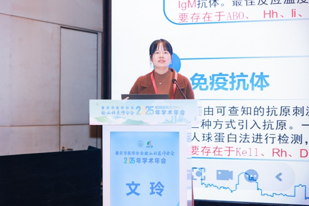 此外,会议还设置了青年医师分专场,旨在分享宝贵的临床工作经验和创新思路,展现新一代输血科医师的专业素养和学术精神。邀请重庆医科大学附属第一医院谭兵教授作《疑难血型鉴定常见问题分析》的分享,重庆市妇幼保健院李春莉教授作《特殊血型孕产妇规范化管理》的分享,重庆市大足区人民医院黄偌颖教授作《从基层血站的角度:如何评估开展一个新的血液产品》的分享,重庆市黔江中心医院文玲教授作《基层医院抗体筛查阳性结果分析与案例讨论》的分享,重庆市血液中心万旭教授作《重庆市中心城区团队及高校无偿献血现状》的分享,重庆市南川中心血站张林芳教授作《新形势下无偿献血招募策略探讨》的分享,重庆市人民医院李静乔教授作《骨关节病患者PRP机采并发症防治》的分享,陆军军医大学第一附属医院易中梅教授作《离心式血浆分离人工肝系统操作要点》的分享,重庆医科大学附属永川医院何翠教授作《血小板活化聚集与中药抗栓活性研究》的分享。