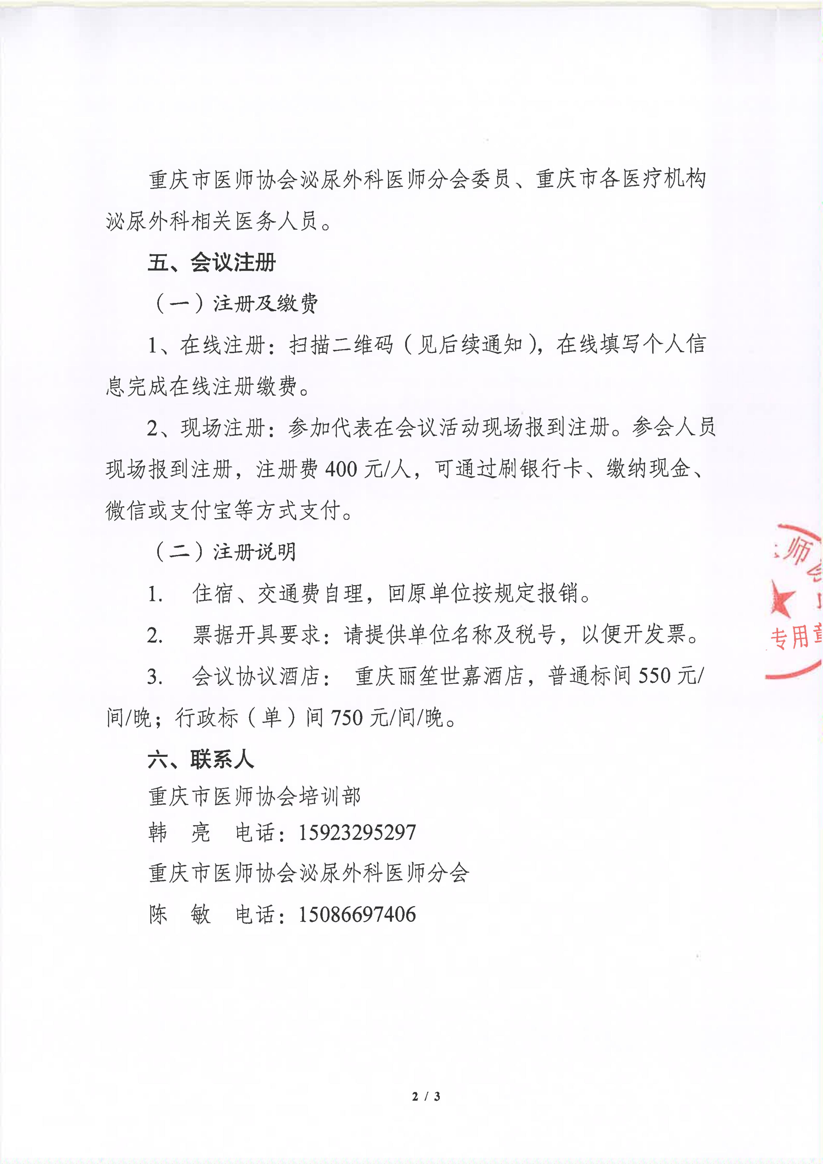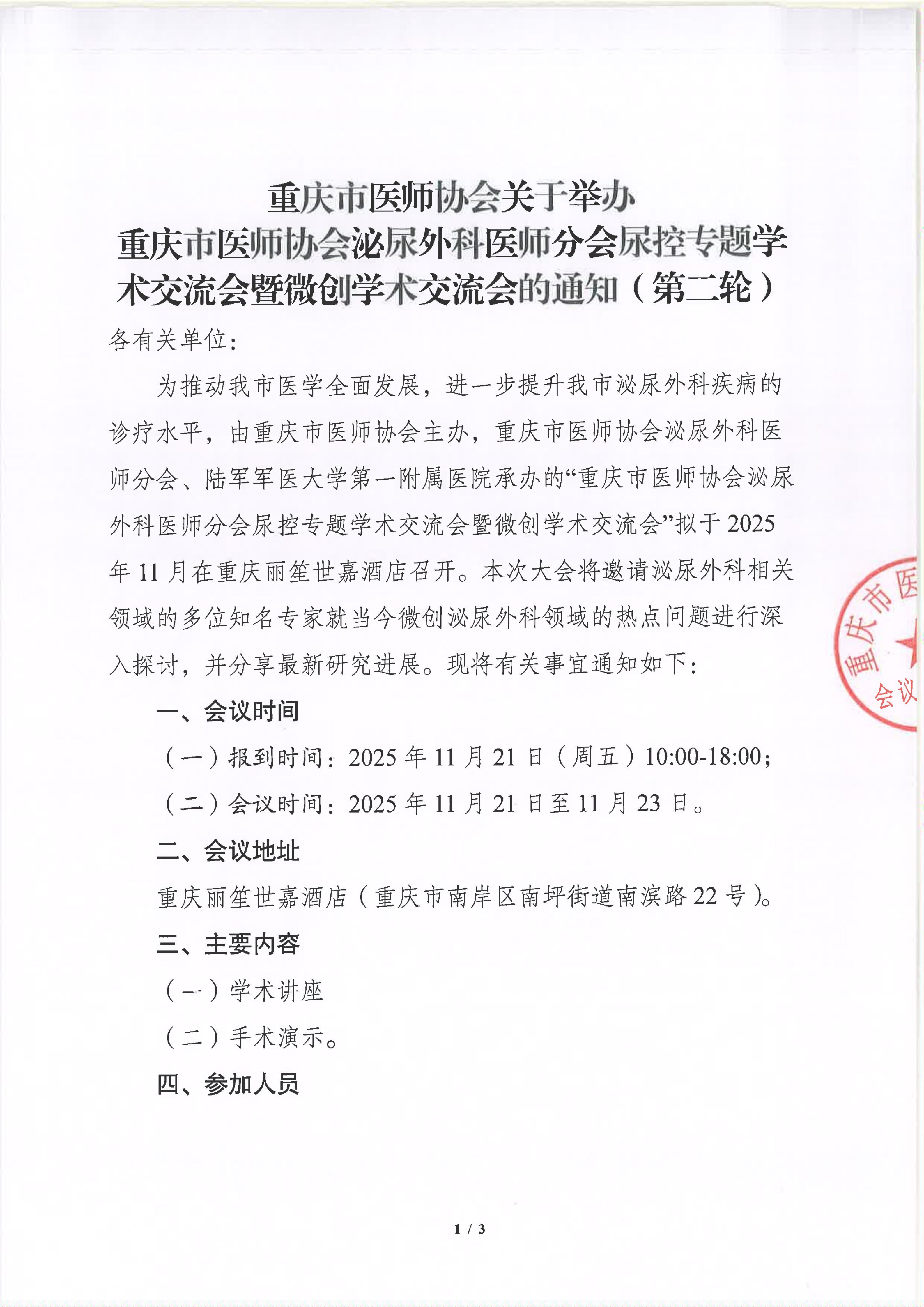 重庆市医师协会关于举办重庆市医师协会泌尿外科医师分会尿控专题学术交流会暨微创学术交流会的通知(第二轮)