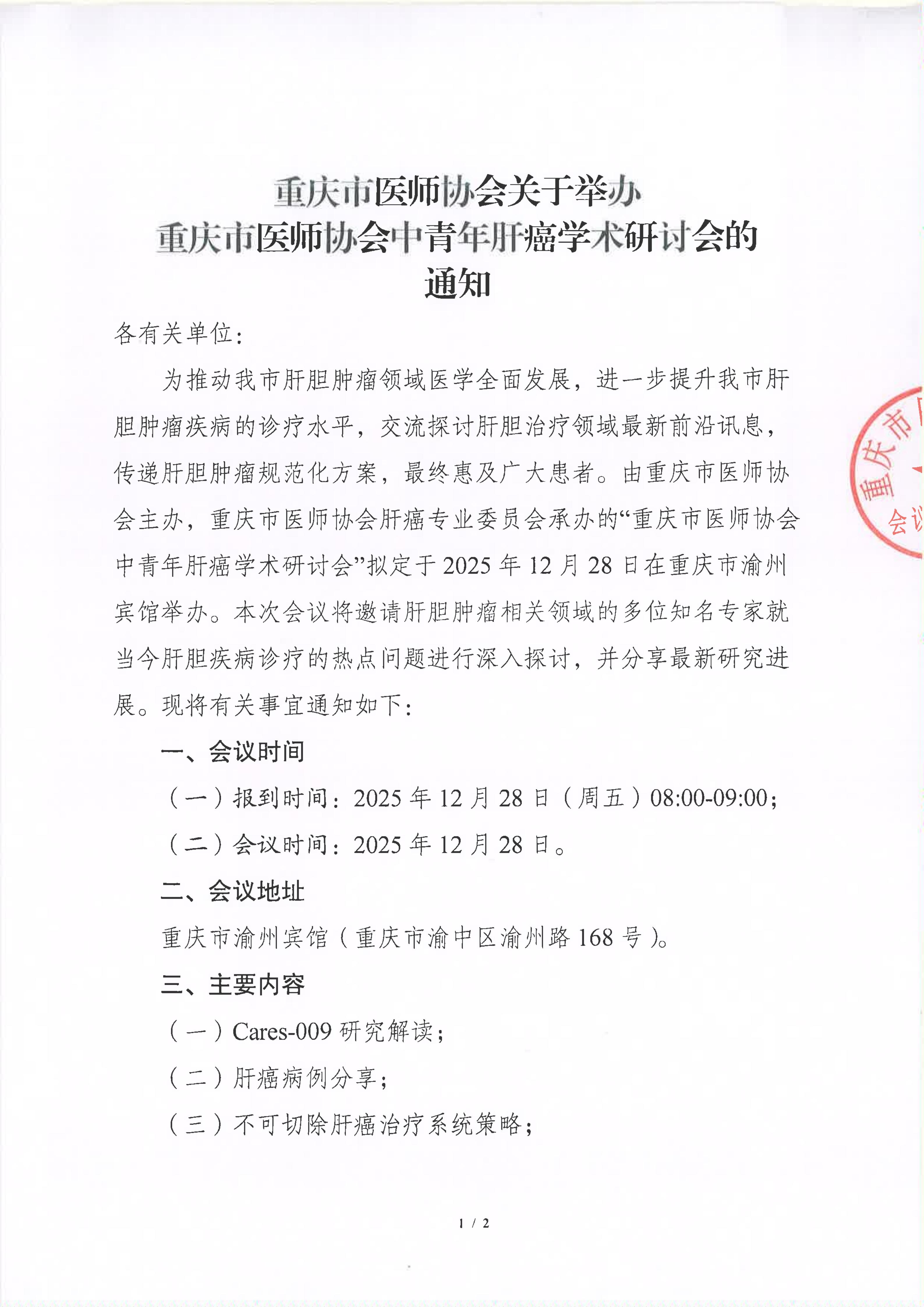 重庆市医师协会关于举办重庆市医师协会中青年肝癌学术研讨会的通知