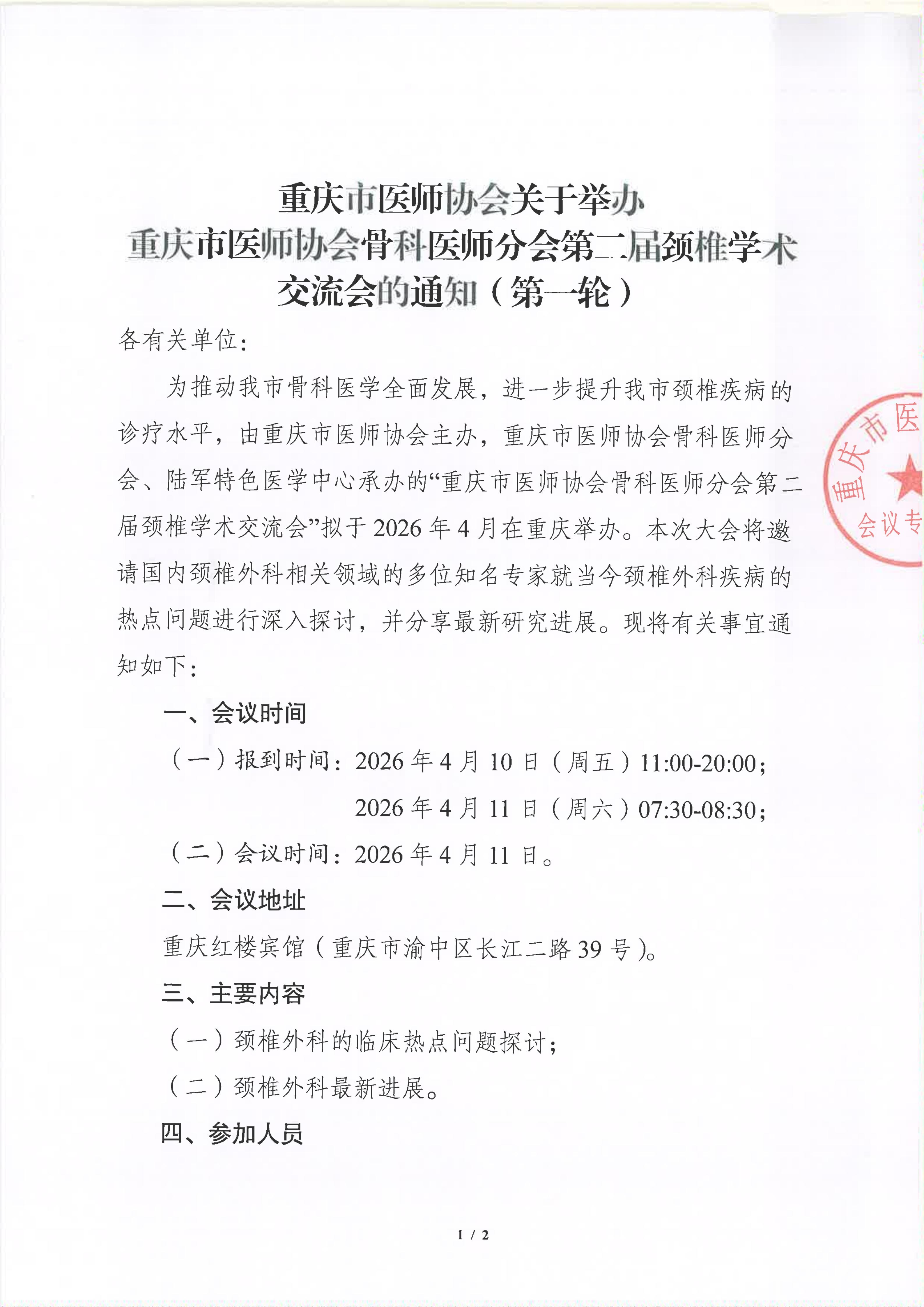 重庆市医师协会关于举办重庆市医师协会骨科医师分会第二届颈椎学术交流会的通知(第一轮)