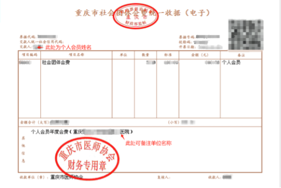 个人会员缴纳会费后,协会按照市财政局、市民政局规定出具《重庆市社会团体会费统一收据》电子票据。(注:按相关规定,个人会员会费票据抬头只能为会员本人姓名,不能开具其他名称。)